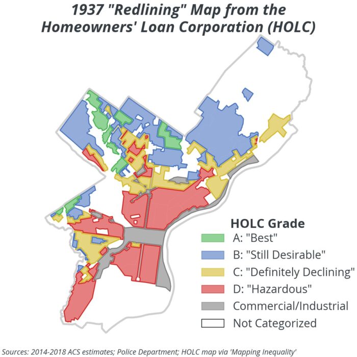 Redlined maps were used for decades by private and public banking institutions to determine areas to invest in and areas to avoid. It’s important to note that redlining was primarily created on the basis of race; a middle-class Black neighborhood was still designated as “Hazardous” to lenders even if residents were in good economic standing. Therefore communities of color, primarily Black neighborhoods, were legally and strategically prohibited from obtaining affordable mortgages.